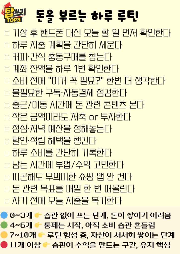 돈을 부르는 루틴은 특별한 기술이 아니라, 반복 가능한 행동입니다. 거창한 재테크보다도 매일의 작은 선택이 훨씬 큰 영향을 미칩니다.