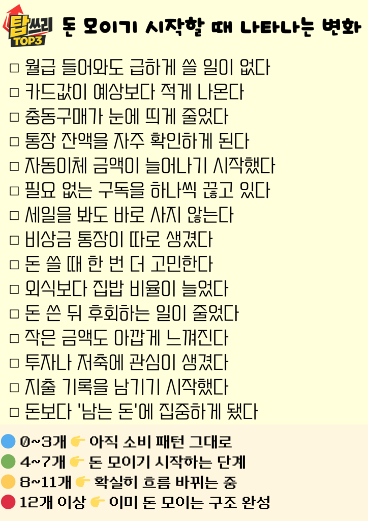중요한 건 수입이 아니라 소비의 방향이 바뀌는 순간입니다. 이 시점이 바로 돈이 모이기 시작하는 출발점입니다.