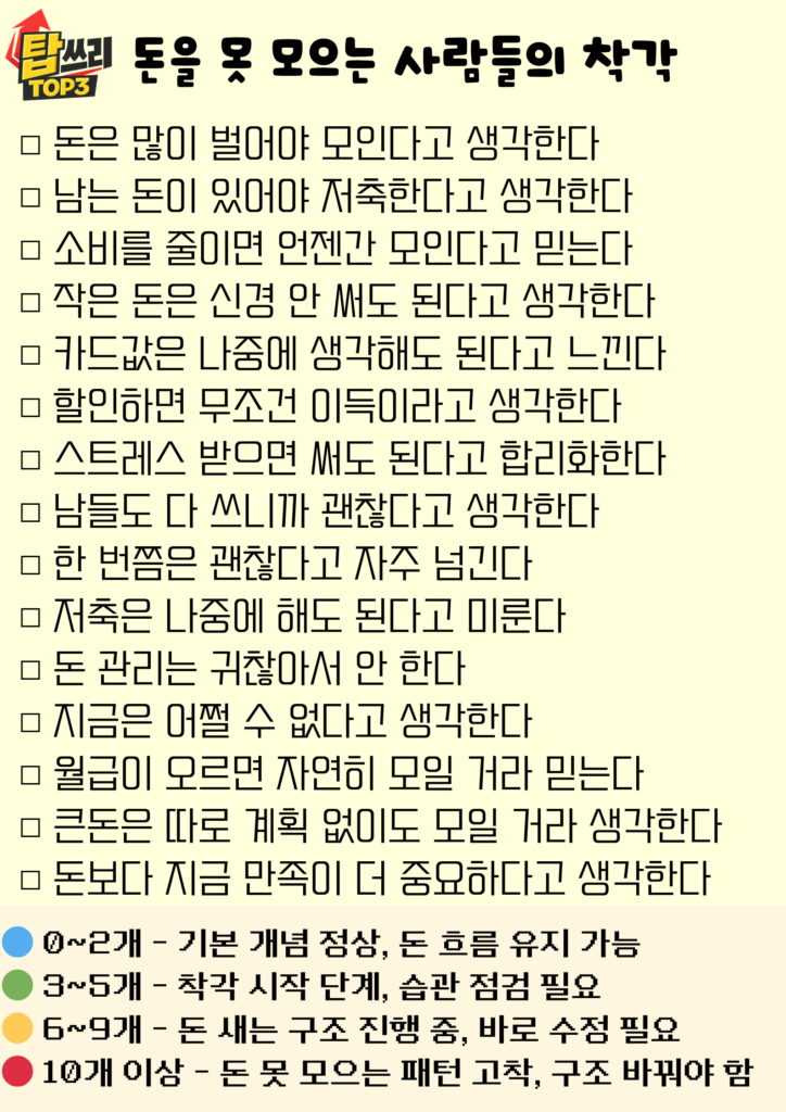 돈을 못 모으는 가장 큰 이유는 잘못된 생각, 즉 착각에서 시작되는 경우가 많습니다.