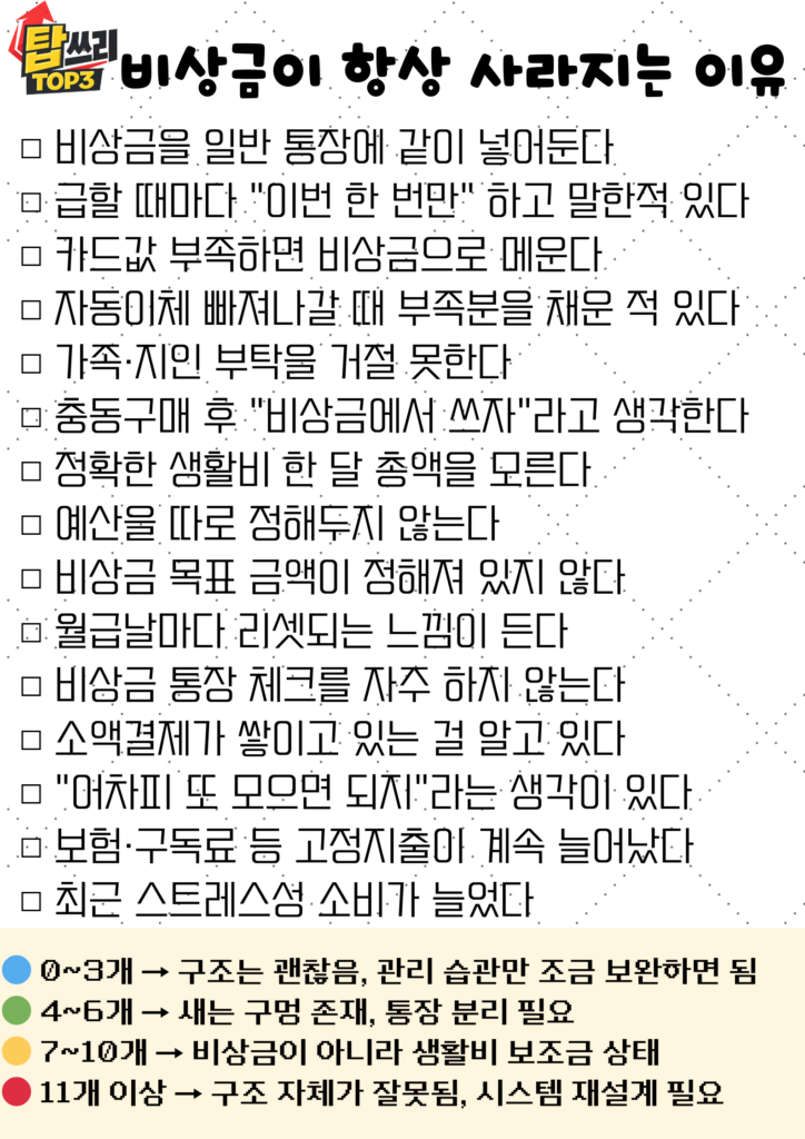 그래서 비상금이 생겼다고 해서 바로 소비를 늘리기보다는 그 돈이 만들어 준 안정감을 유지하는 것이 중요합니다. 안정적인 기반 위에서 돈 계획을 세우면 훨씬 현실적인 선택을 할 수 있습니다.