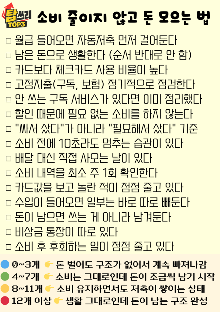 구매 전에 한 번 더 생각하는 것, 다른 선택지가 있는지 확인하는 것, 당장 사지 않아도 되는지 스스로에게 묻는 것만으로도 결과는 크게 달라집니다. 이런 작은 과정이 쌓이면 소비 패턴 자체가 바뀌게 됩니다.